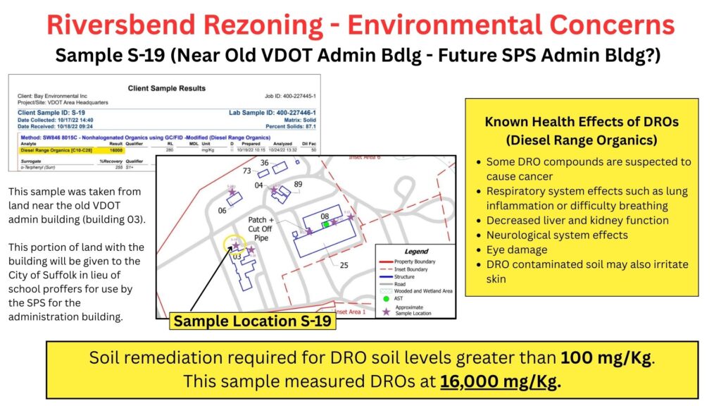 The high levels of DROs, the associated health risks, and the remediation were not included in Mr. Hughe’s presentations (there were two!) to Suffolk’s School Board about the VDOT administration building. Is the School Board even aware of this? They already would have to contend with the mold, asbestos, and lead paint in the building itself. Do they want to add this remediation cost and time to their limited window to complete a new school administration building?