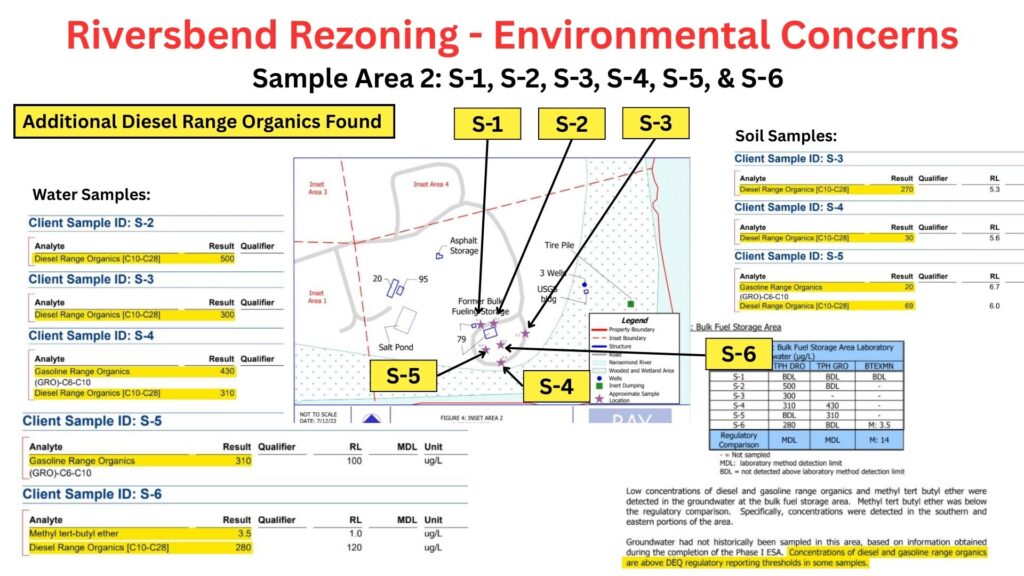 On Slide 2, additional areas were found to have DROs above the 100 mg/kg remediation level. This area is on the southeast portion of the parcel adjacent to the Nansemond River. The rezoning application shows this portion of the site remaining B-2 (commercial) and as the possible location for a marina (which has since been downgraded to a kayak launch.)