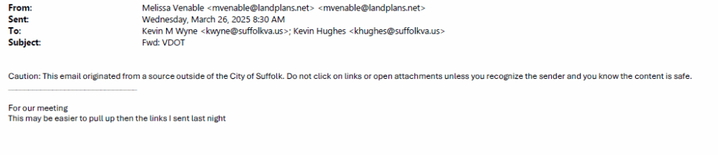 • March 19, 2025 – Email from Melissa Venable, of Land Planning Solutions, to Kevin Hughes to set up a meeting to “move forward with the VDOT property zoning”