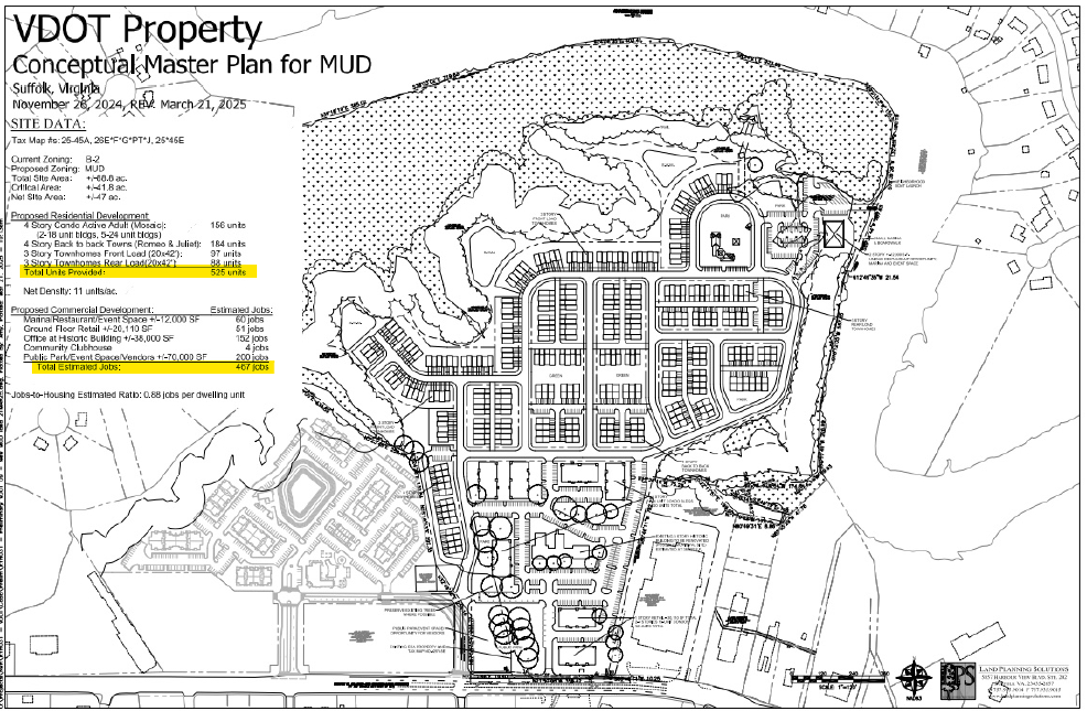 • March 26, 2025 – Email sent ahead of meeting with site map. Map had an original date of November 26, 2024  and then updated Mar 21, 2025, already showing EDA land as part of the site plan. (The EDA is the City’s Economic Development Authority board, so the land is owned by the City of Suffolk.)