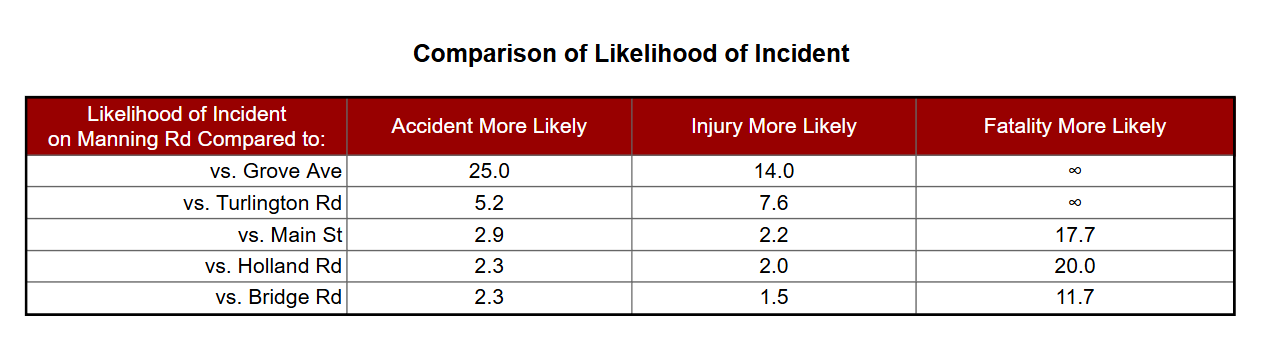 A trip down Manning Road is 25 times more likely to experience an accident than a drive on Grove Avenue. Below is a Comparison Chart that compares the likelihood of an incident to occur on Manning Road compared to other selected roads in Suffolk.