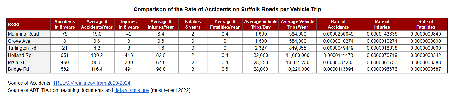 What this data is telling us is that if you are a driver in Suffolk, you are more than twice as likely to get in an accident while on Manning Road than when you turn onto Holland Road. That seems counterintuitive because there are far more accidents on Holland Road than Manning Road, but there are also thousands more cars traveling on Holland Road every day. For every 1 driver on Manning Road, there are 20 drivers on Holland Road.