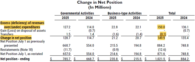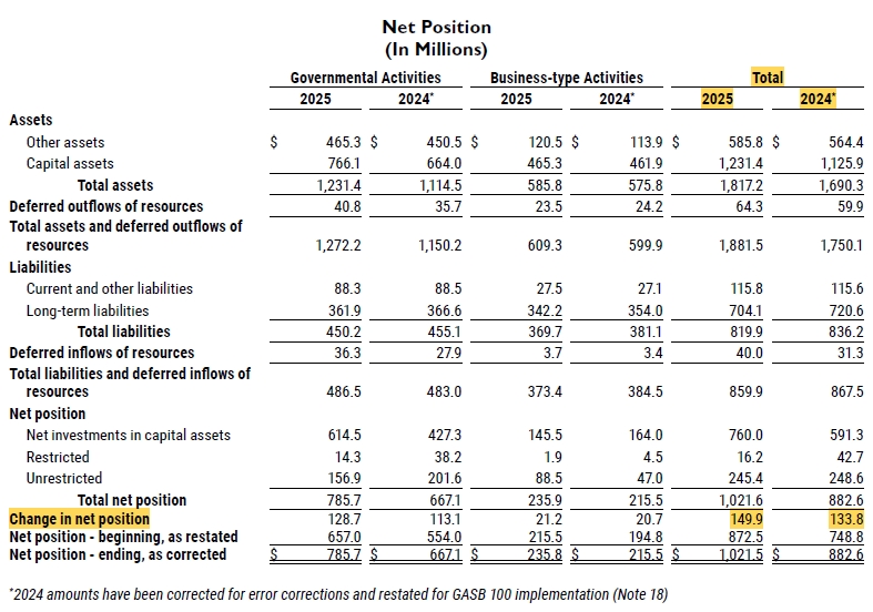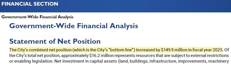 “The City’s combined net position (which is the City’s “bottom line”) increased by $149.9 million in fiscal year 2025” (Pg. 8 of ACFR). For FY2024, the City’s “bottom line” increased by $133.8 million.