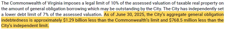 In regards to the City’s debt and borrowing capacity, the state allows a locality to borrow up to 10% of the assessed value of taxable real property within the locality. Suffolk has imposed a lower threshold, allowing borrowing up to 7% of the assessed valuation. The City currently has $768.5 million in available “credit” when looking at the City’s imposed limit and $1.29 billion in available “credit” when comparing to the state threshold. (ACFR Pg. 53)