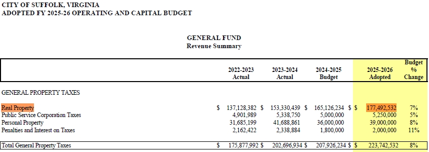 The City of Suffolk’s recently released 2025 Annual Comprehensive Financial Report (ACFR) paints a picture of a municipality in a remarkably strong financial position. While the report was published without a public announcement just before the holidays, its contents are of significant public interest. City finances, with their various funds and activities, can be complex, but this analysis will highlight the key takeaways from the report. Specifically, we will examine the substantial budget surplus the city has accumulated for the second year in a row, how our tax rates and household tax burdens compare to the rest of the Hampton Roads region, the city’s extensive and largely untapped borrowing capacity, and whether our current economic development strategy is truly serving the best interests of Suffolk’s residents.
