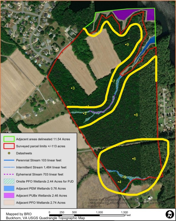 The Yellow circle is the area south of the railroad. This area can not be developed. The two other yellow lines show the approximate location of the 100 foot buffer for the reservoir and the perennial stream. The area within the 100 foot buffer can not be built on.