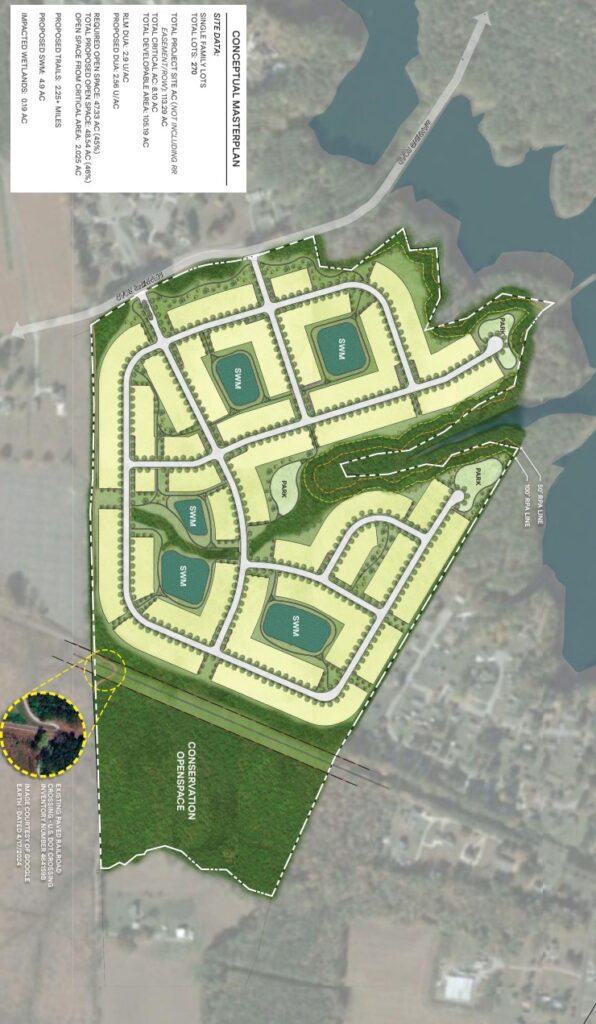 These are not 49 acres he is choosing to leave open. He has no choice because he can’t build within 100 feet of the water because it is a drinking reservoir and has a required buffer. This 100 foot buffer also follows the stream that bisects his property. In addition, he has no legal right to cross the railroad tracks that divide his property. In reality the developer has 64 acres that he can actually build on.