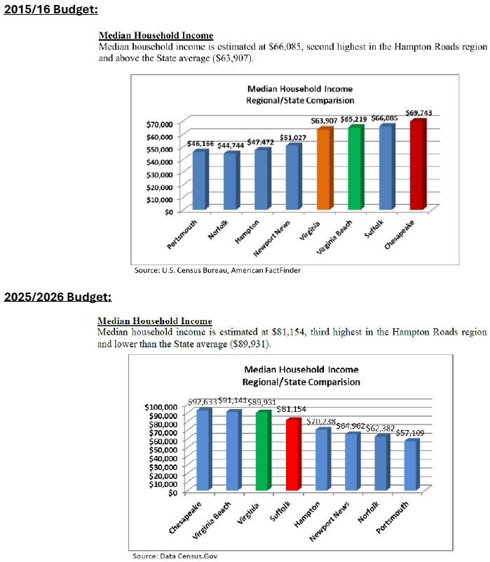 According to the City’s budget documents and US Census Bureau, in 2014 Suffolk had a median household income of $66,085 vs. $63,907 for the entire state, resulting in a net of +$2,178 per household. In 2024, Suffolk had a median household income of $81,154 vs. $89,931 for the entire state, resulting in a net of -$8,777 per household.