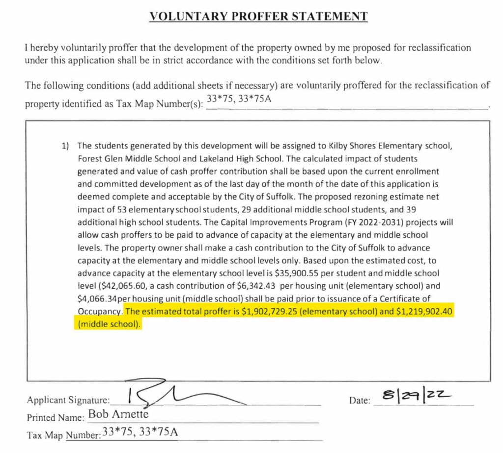 The school proffers have decreased by $1.2 million. In 2022, the developer was offering $1.9 million for Kilby Shores Elementary and $1.2 million for Forest Glen Middle Schools.