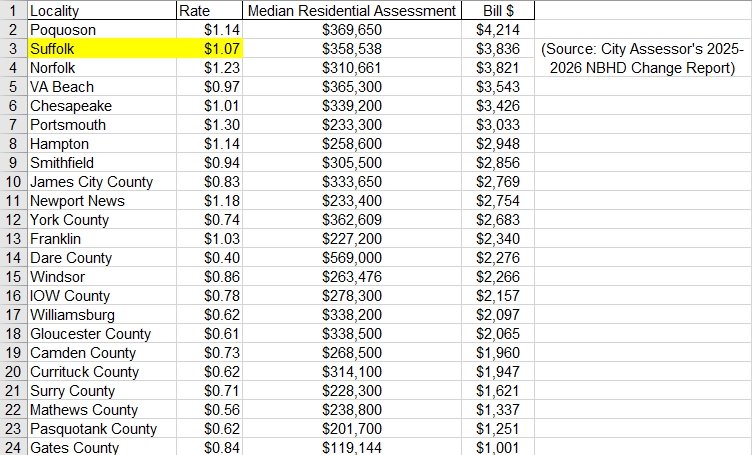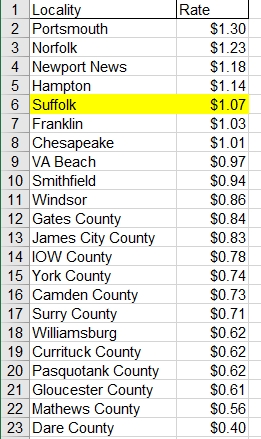 And before anyone tries to claim that Suffolk has the “3rd lowest rate in the area”, Suffolk actually ranks 5th highest for Real Estate Tax Rate out of the 22 areas that make up the Hampton Roads Metropolitan Statistical Area (MSA), which is how the Census defines Hampton Roads.