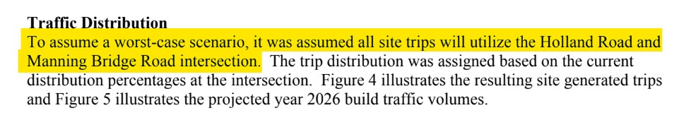 If you are familiar with the site location on Manning Road, you know how ludicrous this statement is. This would mean all cars head south from the site on Manning Road and go the long way (about 4 miles!) to catch Holland Road 3 miles WEST of the Manning Rd/Holland Rd intersection.