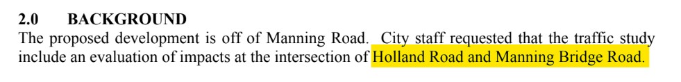 In 2022 the developer, Bob Arnette, provided a traffic study for Manning Bridge Rd instead of Manning Rd. The analysis stated: