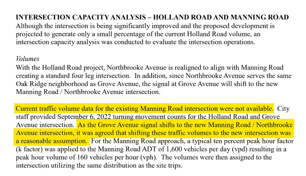 By 2024, he provided a new traffic study, but this one is also NOT for Manning Road. Instead, the developer used existing city data for the Grove Ave/Holland Rd intersection.